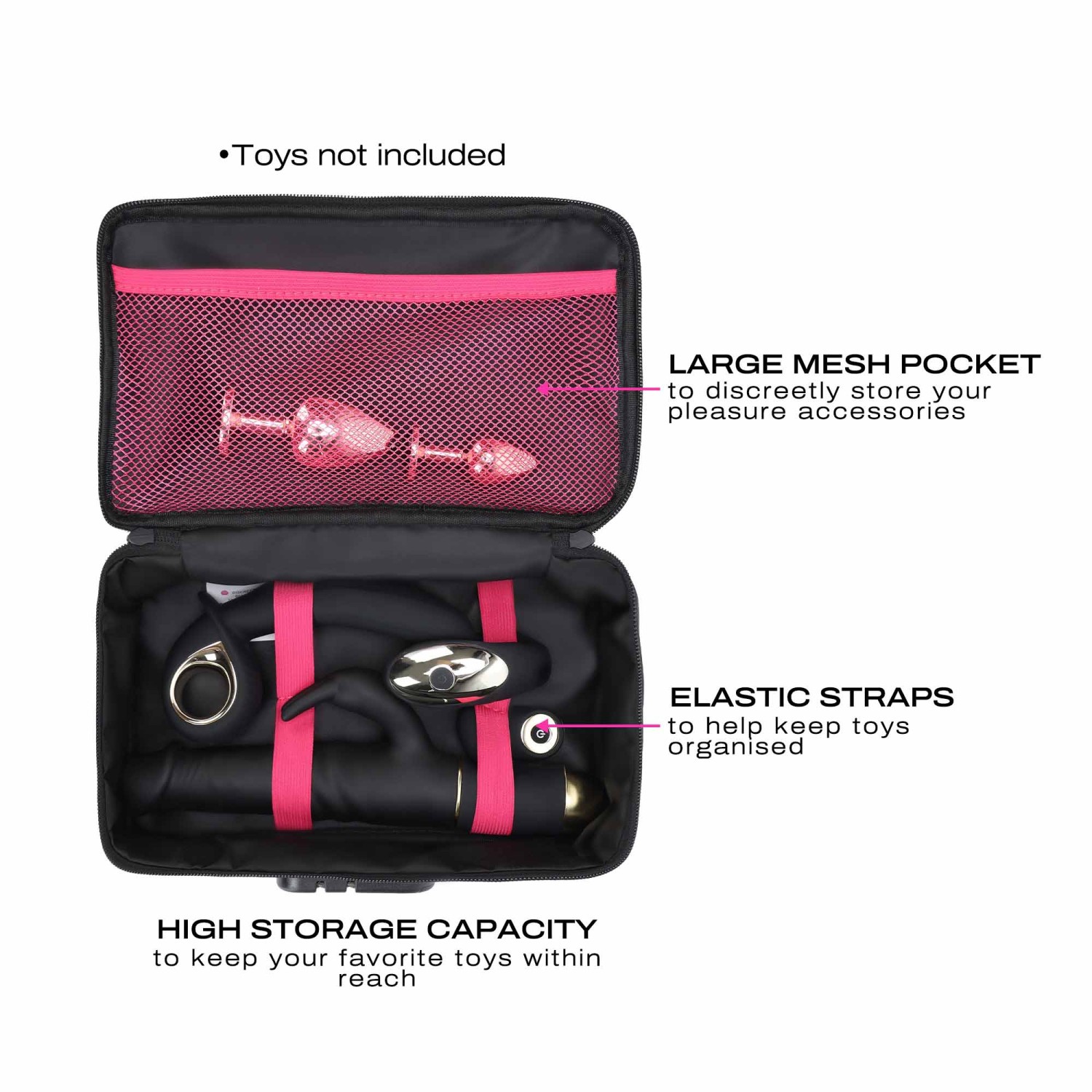 Sa grande capacité de rangement permet de stocker environ 4 à 5 sextoys de taille moyenne, tout en gardant chaque objet bien en place grâce aux sangles élastiques et à la pochette intérieure. Sur les versions Luxury, la pochette en filet zippée améliore encore l’organisation et le maintien des jouets.